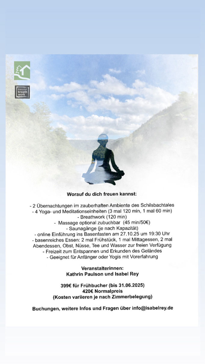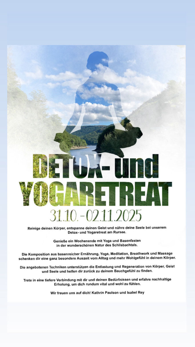 Vom 31.10. bis 02.11.2025 biete ich zusammen mit Kathrin Paulson (www.kathrinpaulson.de) wieder ein Detox- und Yogaretreat im zauberhaften Schilsbachtal an. Weitere Infos findest du unter „Yoga“ und dann „Reatreats“.